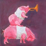 2008Illustratie, prent, dieren varkens, muziek, hemd, trompet