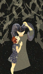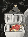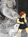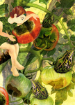 2014Geduld op papier 03: Dit werk is ontstaan naar aanleiding van de een tekst van Irma Derks: . Ze lustte geen tomaat . De tomaat werd haar vriendje. . Natuurlijk at ze nog steeds geen tomaat. . maar Tomaat mocht en moest mee naar bed.